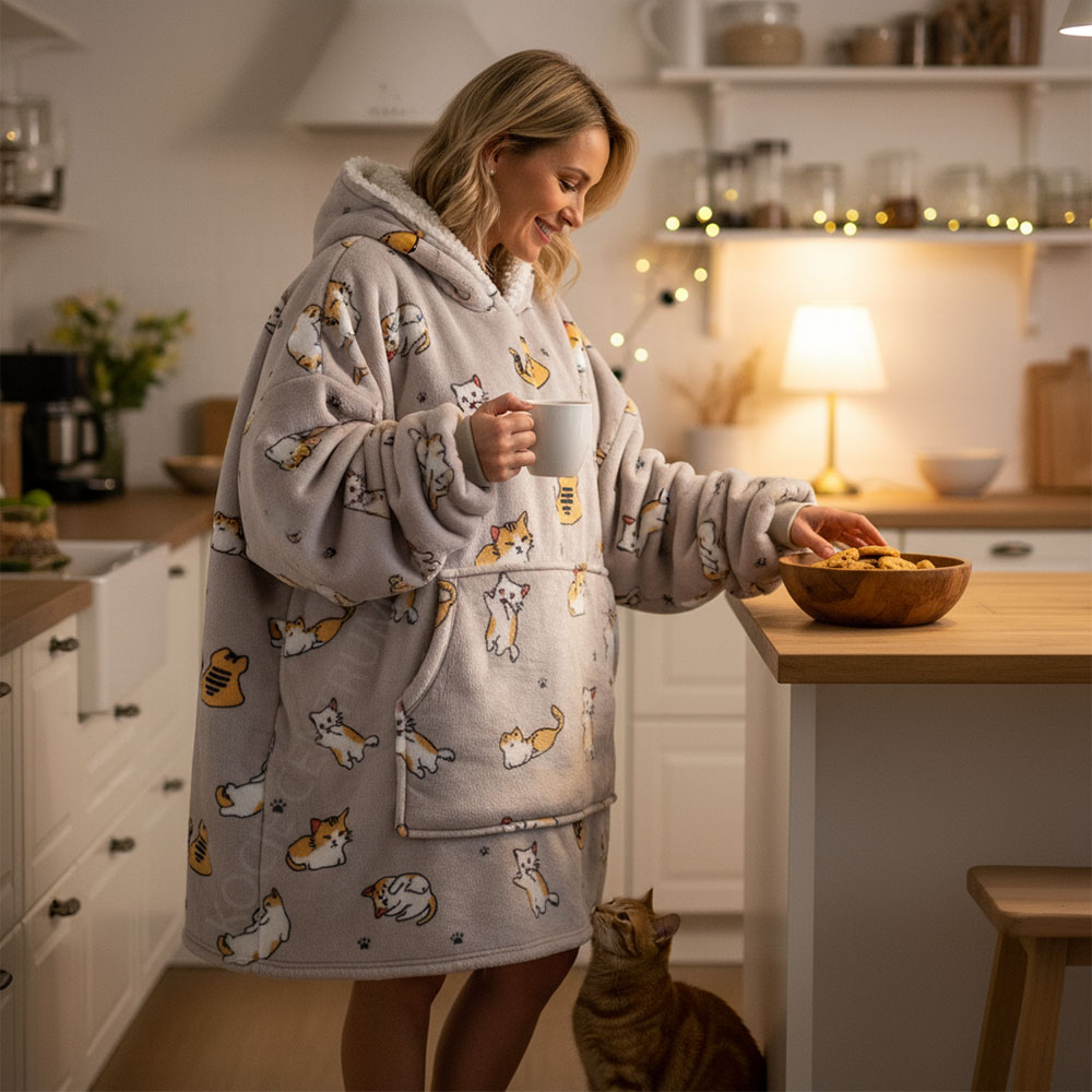 Znasz ten moment, gdy chcesz się opatulić kocem, a po chwili musisz wstać po herbatę czy przekąski? Zwykły koc wtedy zsuwa się z ramion, a szlafrok bywa za cienki i mało praktyczny. LazyCat łączy najlepsze z obu światów – otula całe ciało jak koc, a jednocześnie możesz w niej swobodnie chodzić, gotować czy bawić się z kotem. Komfort zawsze z Tobą, bez marznięcia i poprawek co chwilę.