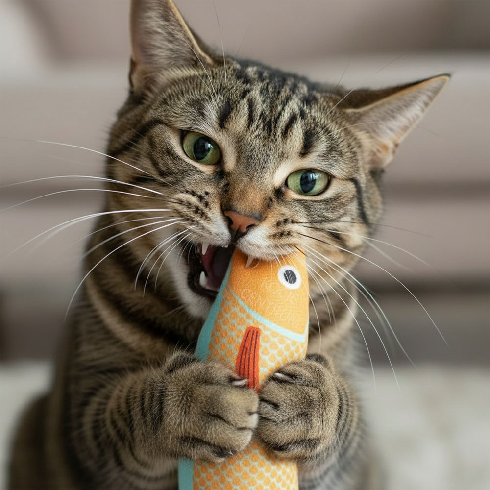 Kiedy kot gryzie i żuje rybkę, nie tylko bawi się i rozładowuje stres – jednocześnie naturalnie czyści swoje zęby. Wbudowana kocimiętka zachęca go do żucia, co pomaga usuwać płytkę nazębną i ogranicza tworzenie się kamienia. To oznacza zdrowszą jamę ustną, świeższy oddech i mniej stresujących wizyt u weterynarza. Rybka dba nie tylko o radość Twojego mruczka, ale też o jego zdrowie każdego dnia.