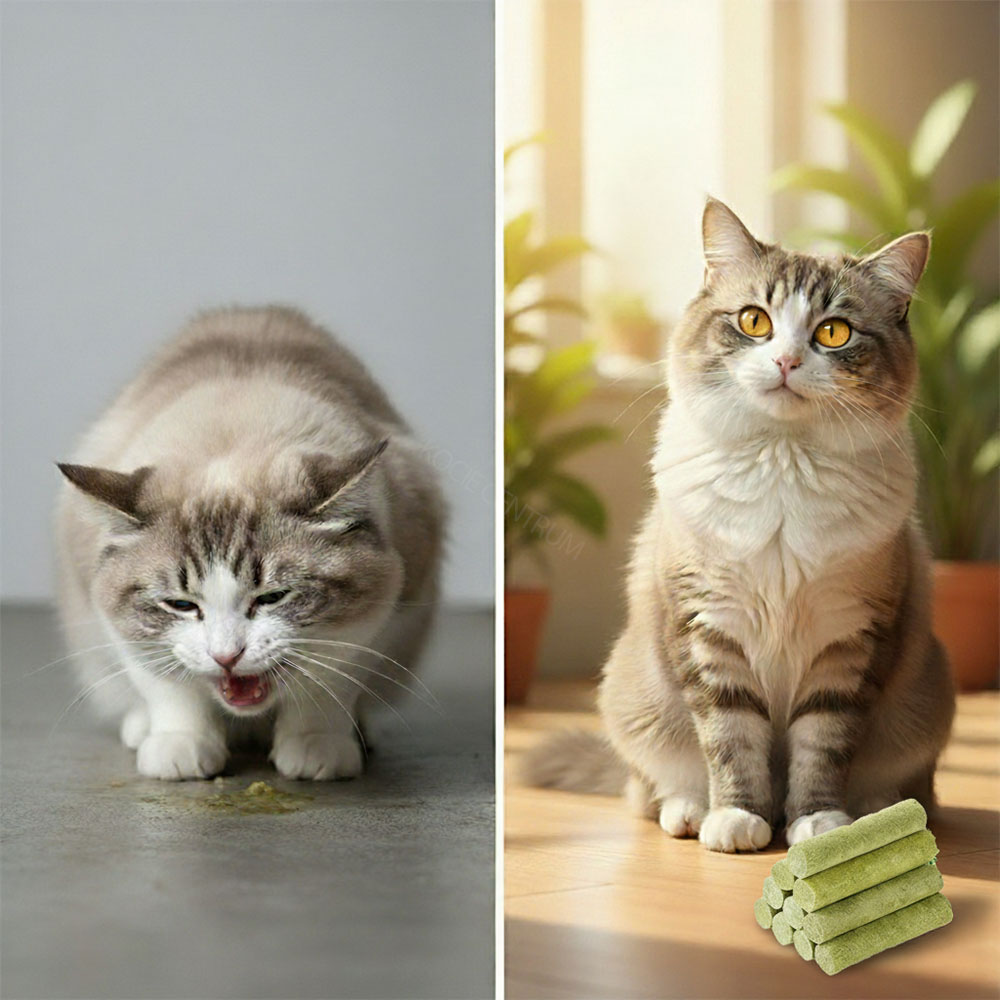 Każdy, kto ma kota, wie jak częste potrafi być wymiotowanie kul włosowych – i jak bardzo męczy to zwierzaka. To nic przyjemnego ani dla kota, ani dla Ciebie, a do tego często budzi niepokój. Trawiaste Pałeczki dzięki naturalnym włóknom pomagają sierści przejść przez układ pokarmowy w bardziej komfortowy sposób. Twój mruczek czuje się lżej, a Ty masz mniej stresu i sprzątania.